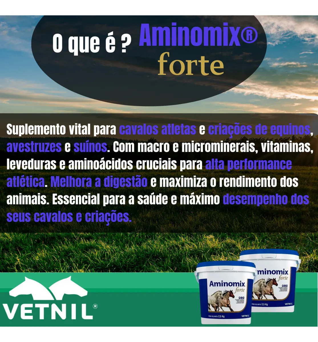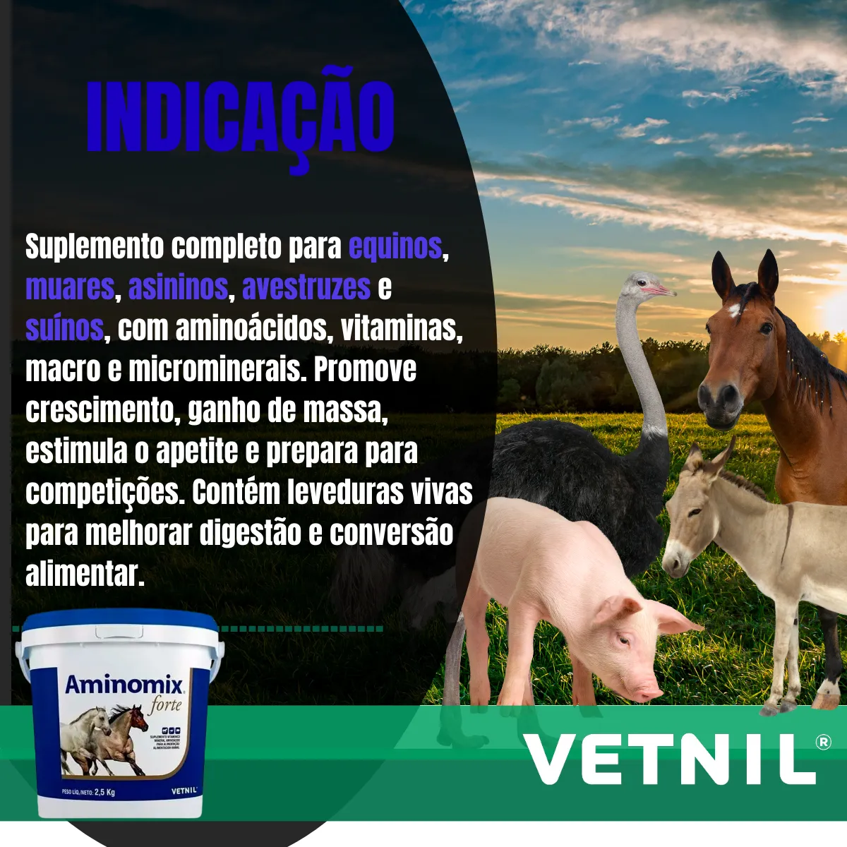 Aminomix Forte 2,5kg da Vetnil é um suplemento completo para equinos, muares, asininos, avestruzes e suínos, formulado com aminoácidos, vitaminas, macro e microminerais essenciais. Este suplemento é ideal para animais em fase de crescimento, auxiliando no ganho de massa corporal e estimulando o apetite, além de preparar os animais para competições e exposições.