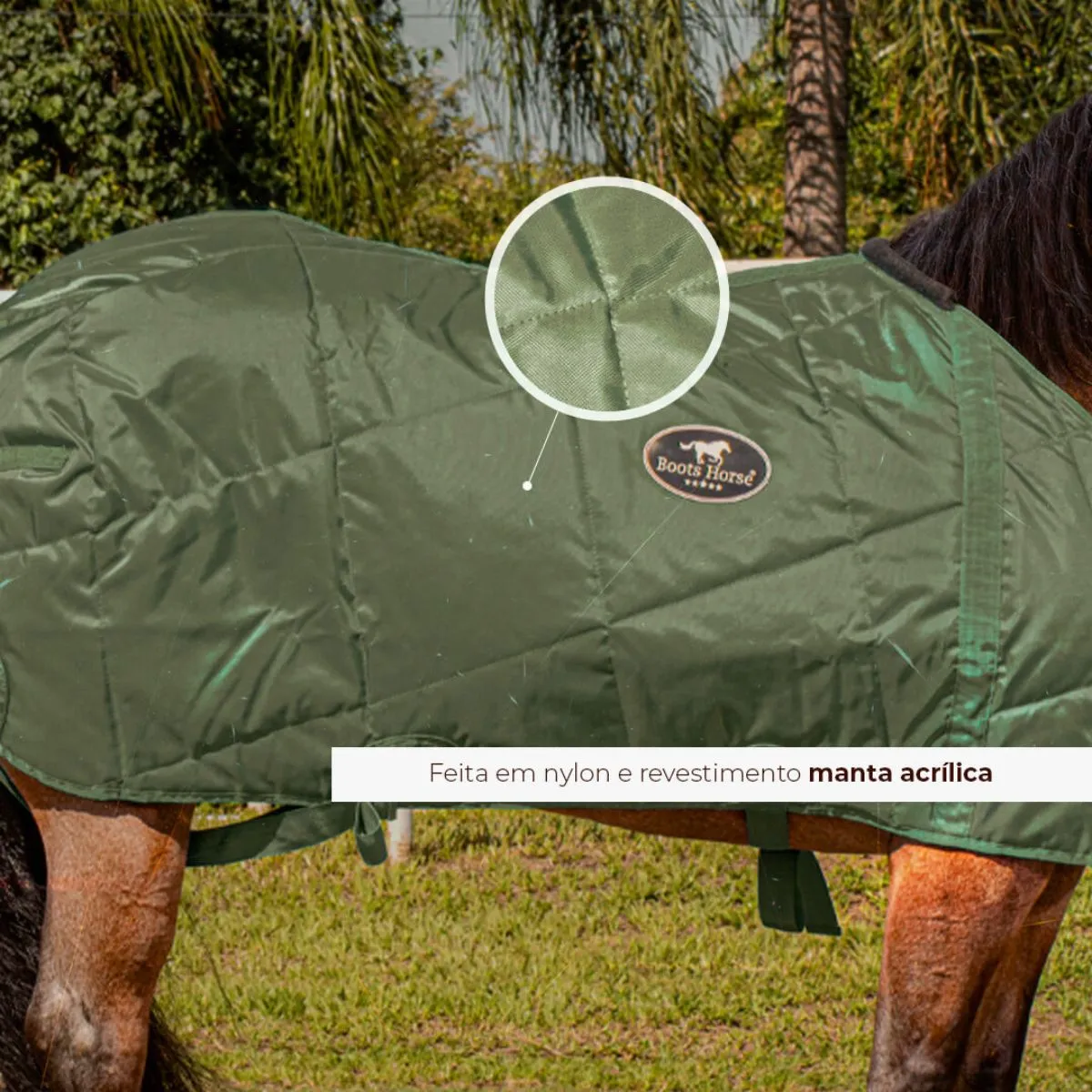 Fechada na frente com alças de nylon e fivelas para regulagem, alças presas entre as pernas traseiras para não virar e por baixo na posição das barrigueiras. Usadas para aquecer o cavalo manter o pêlo liso em dias mais frios.