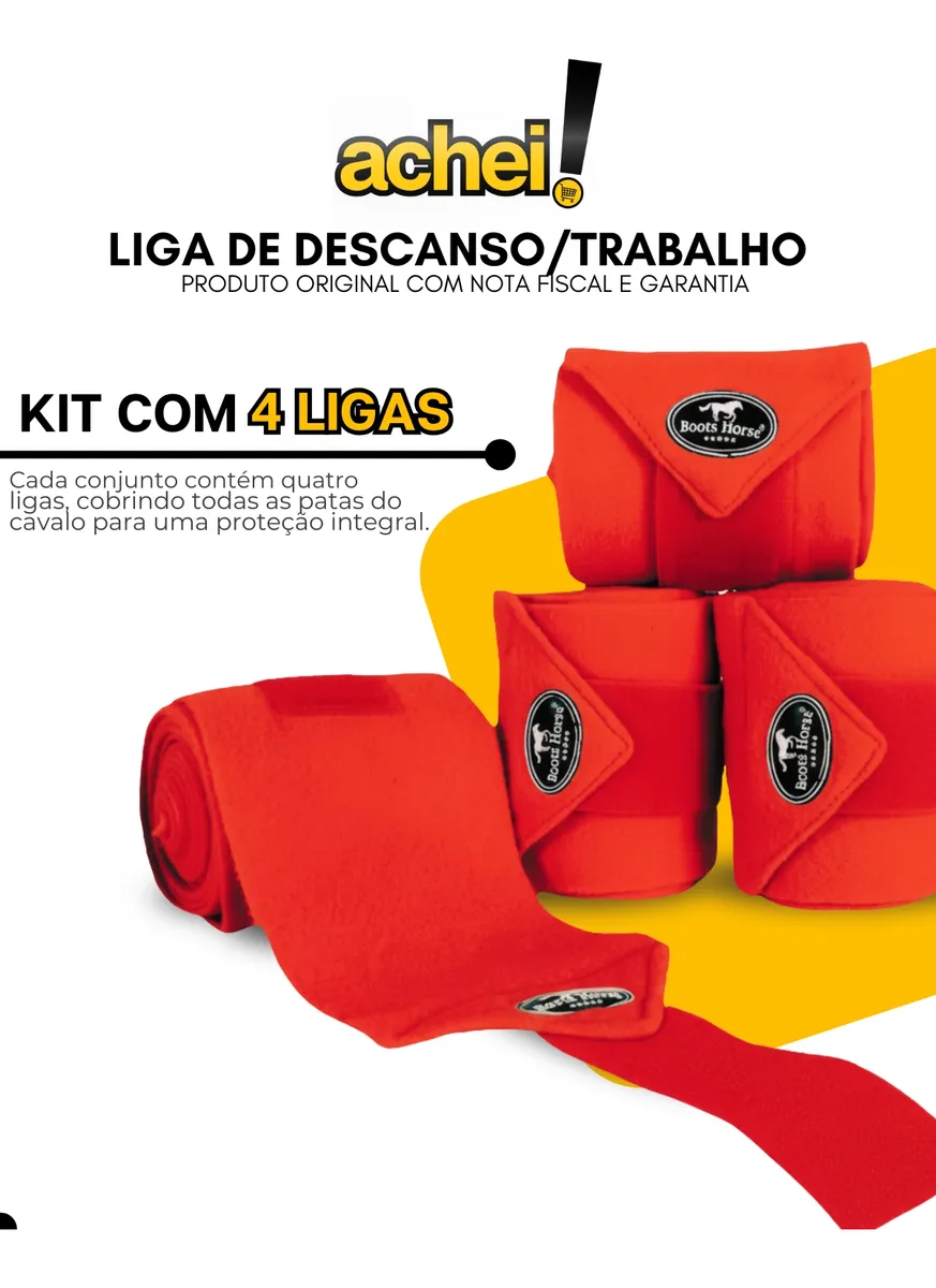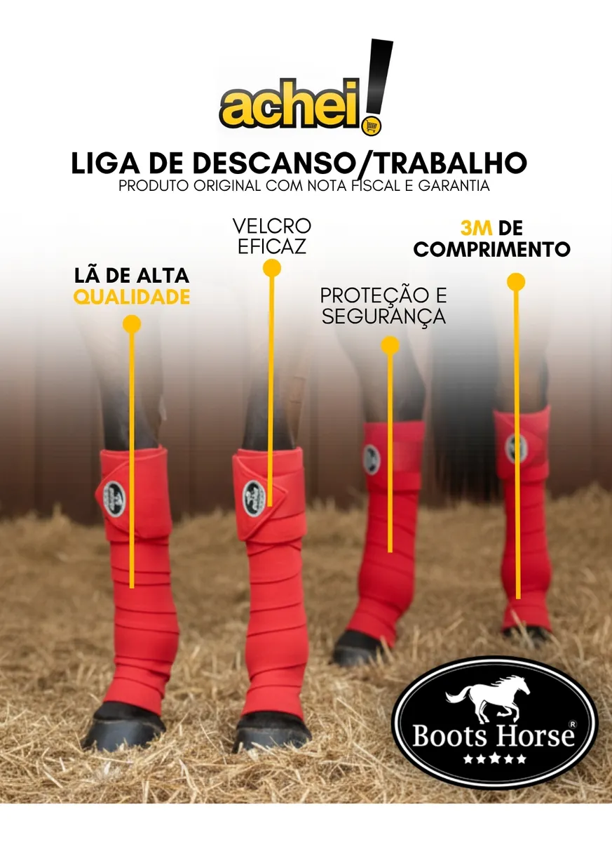 Confeccionadas com lã de alta qualidade e cuidadosamente projetadas para oferecer o equilíbrio perfeito entre flexibilidade e segurança. Com a quantidade ideal de elasticidade, essas ligas se ajustam de maneira fácil e segura, fornecendo um suporte confiável e uma camada protetora. Cada liga abrange aproximadamente três metros de comprimento e é comercializada em conjuntos de quatro unidades, garantindo uma cobertura completa para todas as patas do seu cavalo.