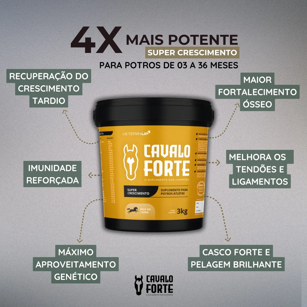 Apresentamos o Super Crescimento, o suplemento desenvolvido especialmente para garantir que o seu potro tenha o suporte necessário para crescer forte, saudável e atingir seu potencial máximo. Cada potro carrega em si um futuro promissor, e o seu papel como cuidador é fundamental para que esse futuro seja brilhante.